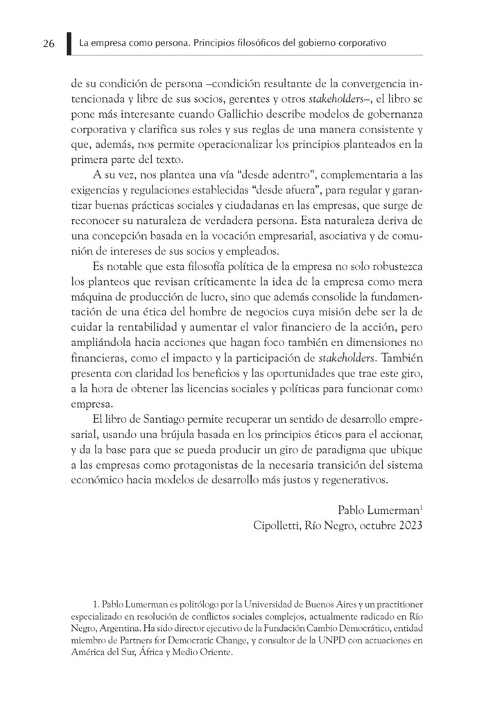 Un abordaje de preguntas clave sobre la relación entre el individuo y la corporación: ¿es posible integrarse a una empresa sin perder la capacidad de acción personal y desarrollar un proyecto de vida propio dentro de ella? ¿Participan todos los empleados en una acción común o se limitan a cumplir sus tareas por una remuneración? Además, esta obra examina cómo los directorios pueden incluir la ética en sus decisiones, considerando a los stakeholders, el ambiente, la diversidad y otros bienes públicos sin desatender sus obligaciones con los accionistas. Con una base filosófica sólida y en diálogo con el lenguaje empresarial, el libro analiza estas cuestiones esenciales en el ámbito de la ética y el gobierno corporativo ¿Qué compromiso deben asumir los directores con sus empresas y qué deber tienen para con los accionistas que los designaron?