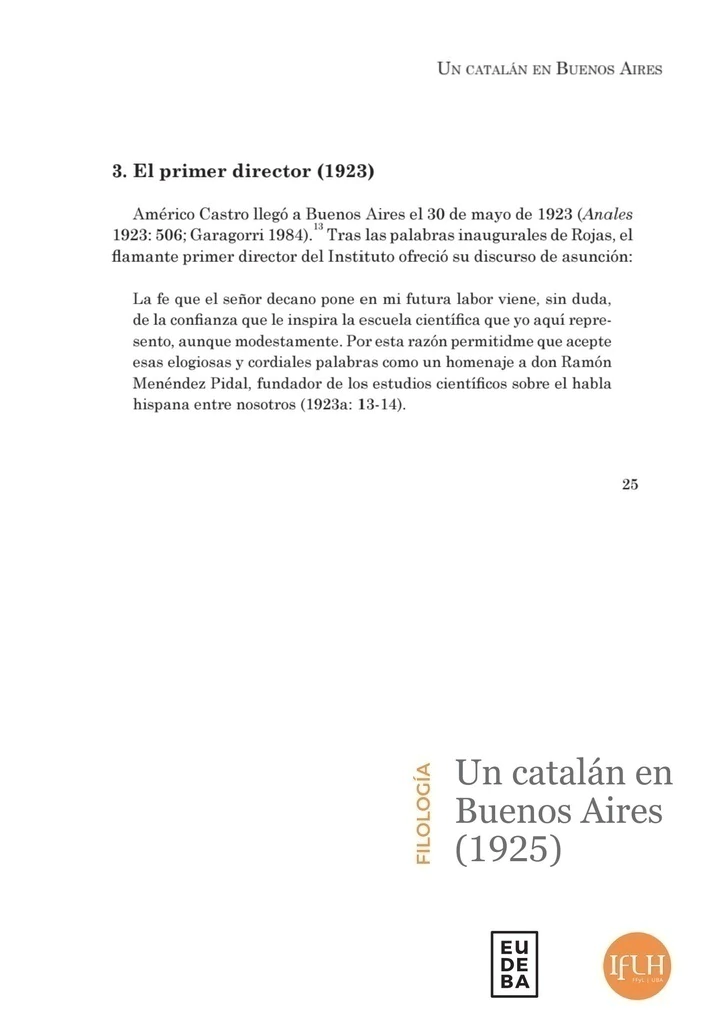 Manuel de Montoliu (1877-1961) arribó a la Argentina en abril de 1925. Este hombre de letras nacido en Cataluña, miembro del Centro de Estudios Históricos de Madrid, formado en Suiza y Alemania había sido designado director del Instituto de Filología de la Universidad de Buenos Aires. Aunque su gestión duró apenas seis meses, constituyó un momento clave en el proceso de emergencia y establecimiento de la lingüística como disciplina académica en el país. El giro epistemológico que practicó significó un quiebre respecto de las gestiones de quienes lo precedieron en el cargo: Américo Castro (1923) y Agustín Millares Carló (1924). Mientras estos velaron por la preservación de una perspectiva positivista, la mirada dialectológica de Montoliu contempló las variedades argentinas y/o americanas del español no como meros desvíos censurables de la norma culta castellana, sino como objetos de estudio legítimos y propios de la expresión idiomática de la región. Durante 1925, Montoliu se convirtió en uno de los pioneros de la difusión del idealismo lingüístico en la Argentina, enfoque que luego fue desarrollado por Amado Alonso, aquel que con su prolífica actividad en las décadas de 1930 y 1940 logró ubicar al Instituto en el ápice de la filología hispanoamericana.
